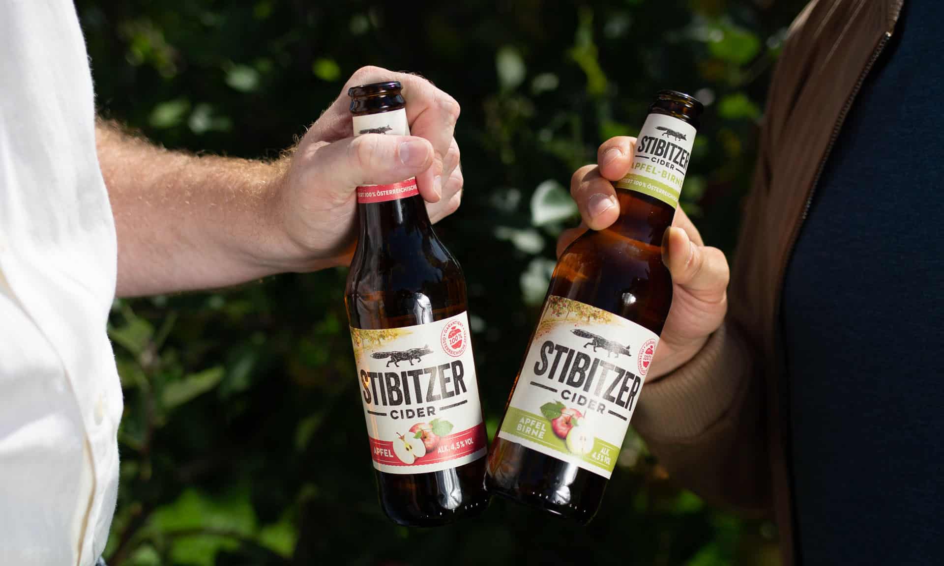 Den Stibitzer Cider gibt es in den beiden köstlichen Sorten Apfel und Apfel-Birne – aber davon erzählt euch der Fuchs am liebsten gleich selbst.
